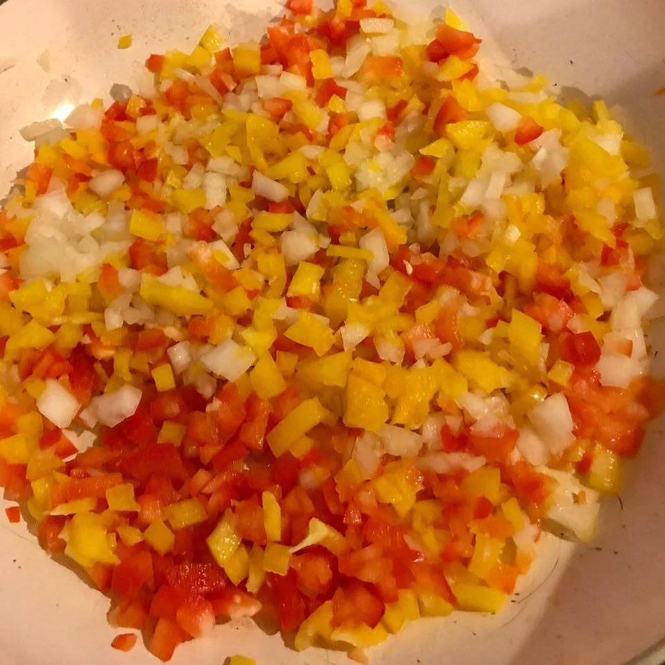 Heat pan over medium heat sprayed with Olive Oil cooking spray. Once pan is heated, add onions, bell peppers, carrots, and garlic and sesame oil. Cook until bell peppers are soft and onions are translucent.