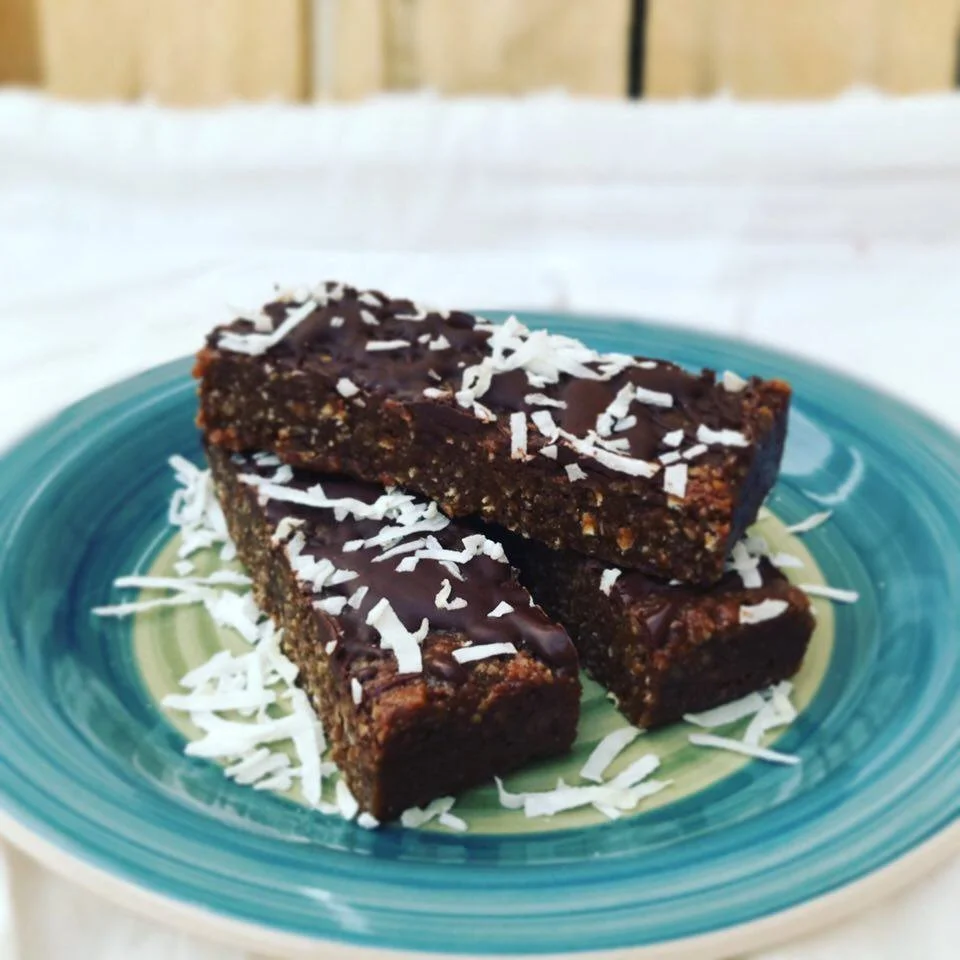 For the topping, heat the coconut oil and chocolate chips over low heat until melted. Drizzle over the 9x9 pan of protein and sprinkle with coconut flakes. Place back in refrigerator until chocolate hardens.