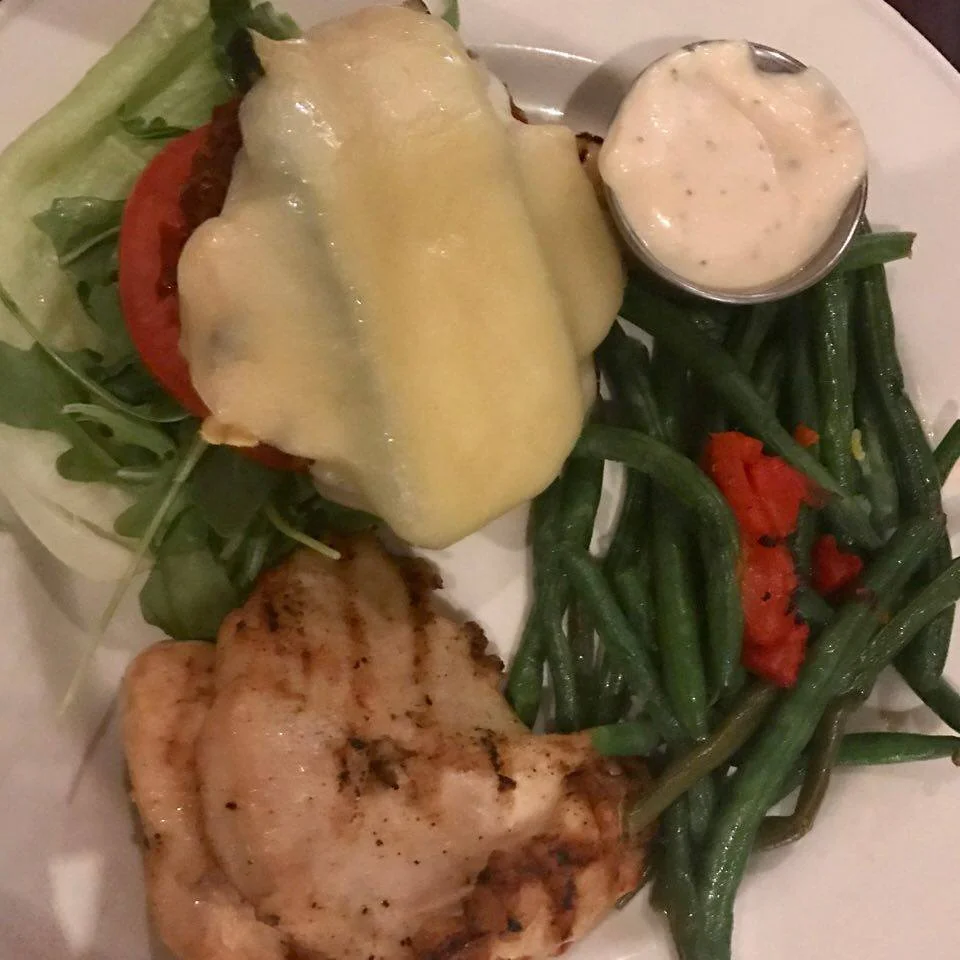 One of our dinners was at the Hard Rock Cafe. I was shooting for "healthier", not perfection. Hidden in all of their delicious burger options, fajitas, and mac n cheese, I found this gem!! It was a cauliflower burger that was supposed to be topped with goat cheese. I asked for the bun to be removed, green beens instead of fries, and chicken breast on the side. I was really looking forward to the combination of cauliflower and goat cheese. I was totally bummed when they topped my cauliflower patty with some other cheese, but we waited FOREVER for our food, so I wasn't about to send it back.