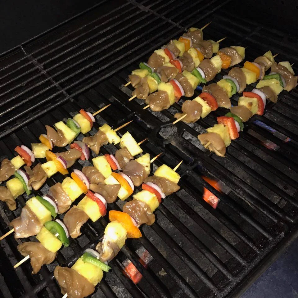 2. If using wood skewers, soak for 20 minutes in warm water before threading. Thread the chicken on skewers along with the peppers, red onion, and pineapple.