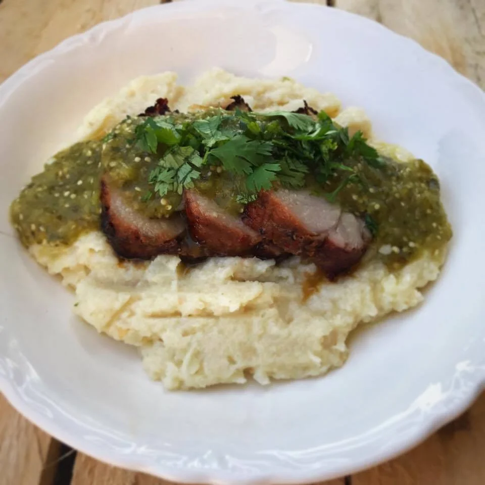 To plate this dish, add sliced pork on top of bed of cauliflower "grits" and top with tomatillo sauce. I hope y'all enjoy this meal as much as I did!!